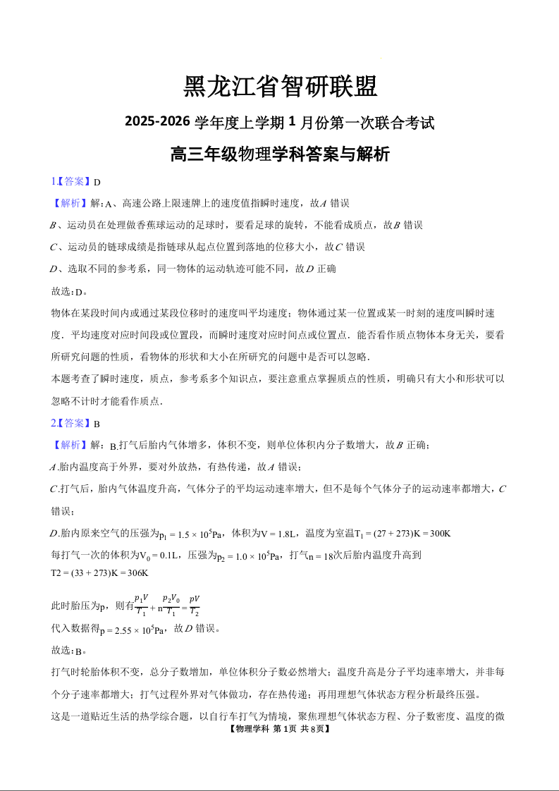 黑龙江省智研联盟2026届高三上学期1月份第一次联合考试 物理答案.docx