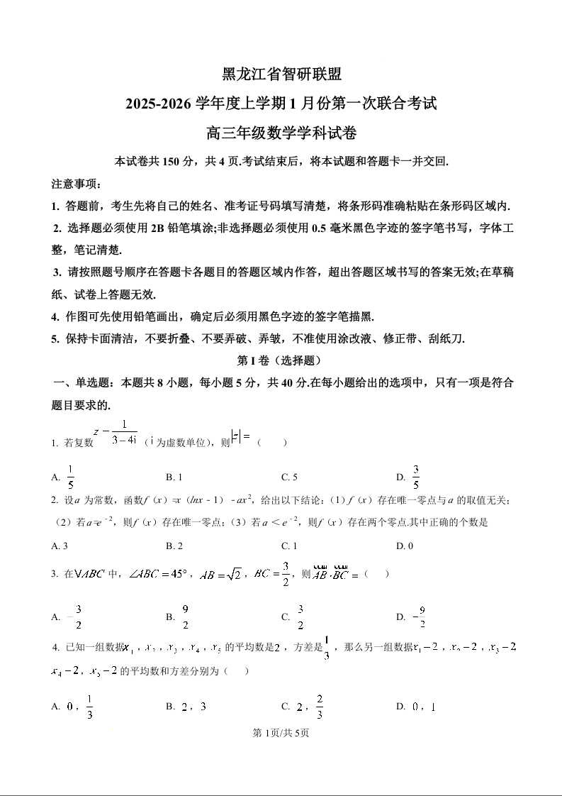 黑龙江省智研联盟2026届高三上学期1月份第一次联合考试 数学.docx