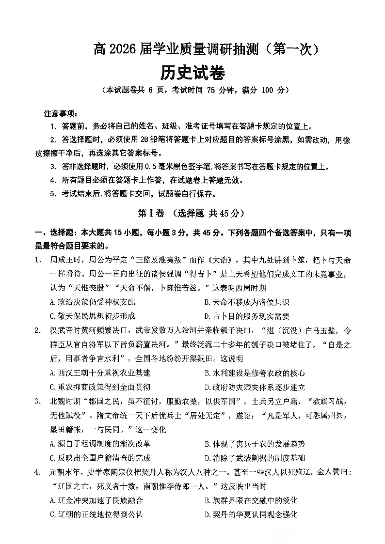 九龙坡区高2026届学业质量调研抽测(第一次)历史.pdf