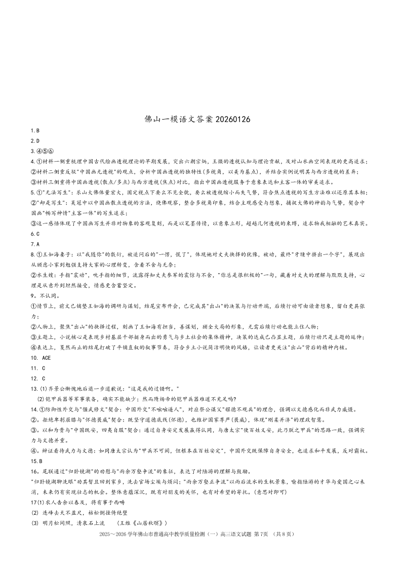 佛山市2025~2026学年佛山市普通高中教学质量检测(一)语文答案.pdf