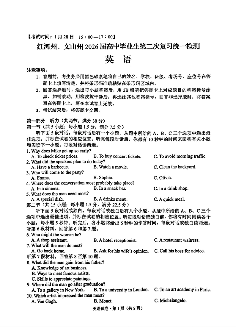 红河州、文山州2026届高中毕业生第二次复习统一检测 英语试题(含答案).pdf