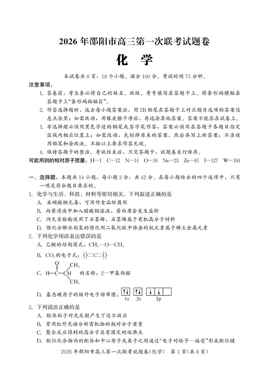 2026年邵阳市高三第一次联考试题卷 化学试题(含答案).pdf