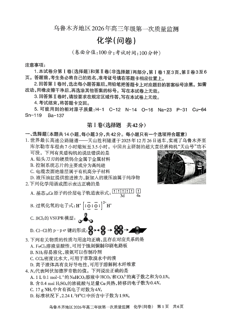 乌鲁木齐地区2026年高三年级第一次质量监测 化学.pdf