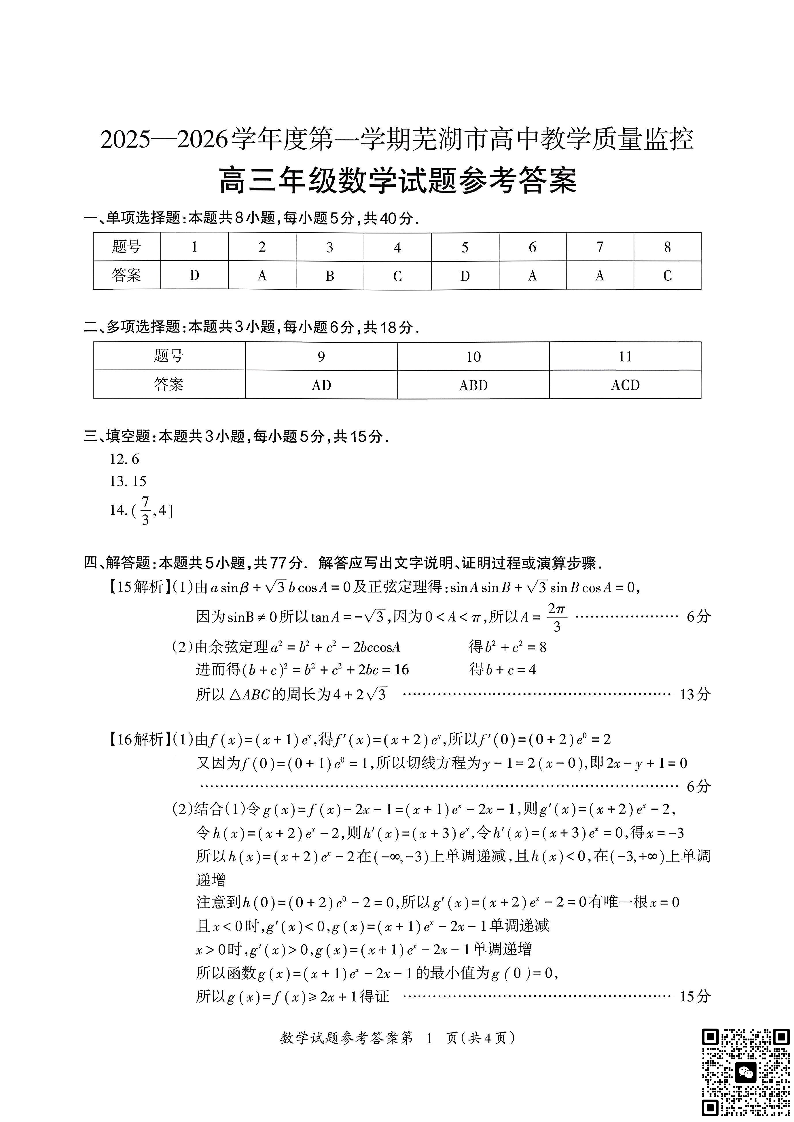 2025-2026学年度第一学期芜湖市高中教学质量监控 数学答案.pdf
