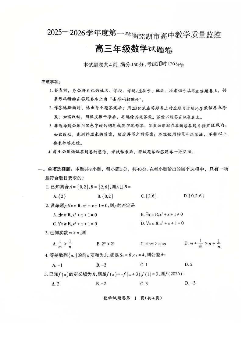 2025-2026学年度第一学期芜湖市高中教学质量监控 数学.pdf