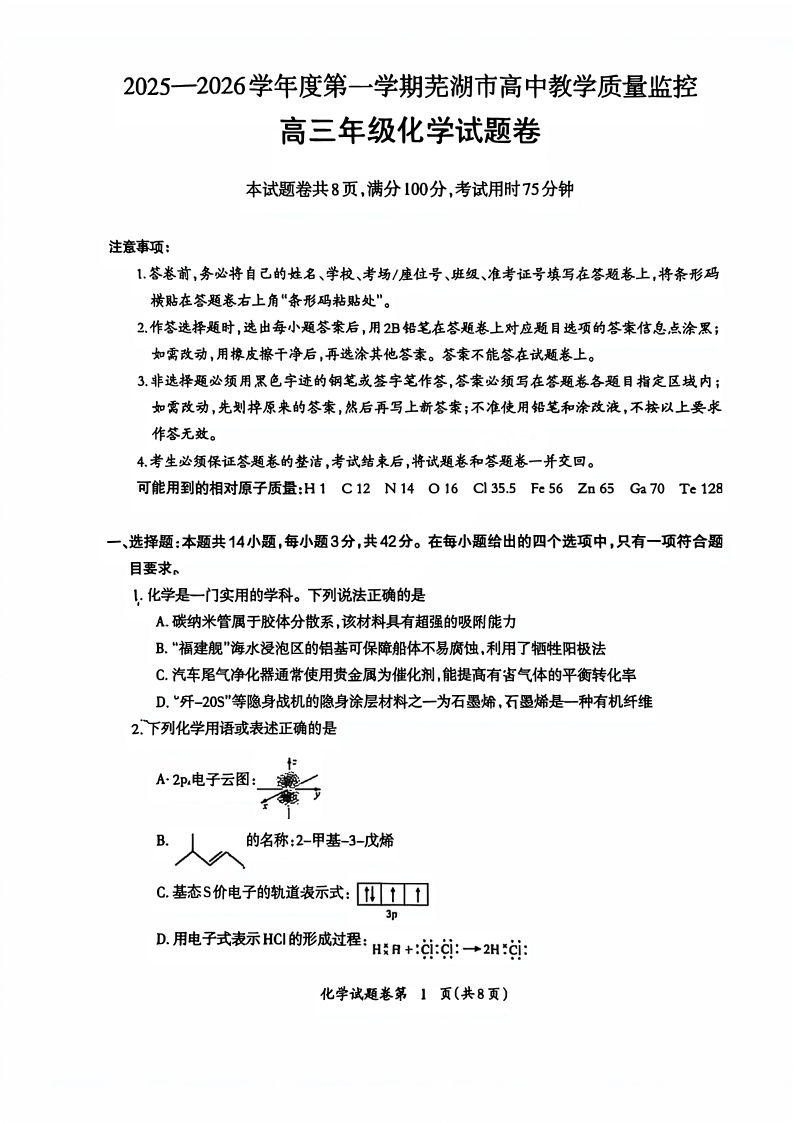 2025-2026学年度第一学期芜湖市高中教学质量监控 化学.pdf