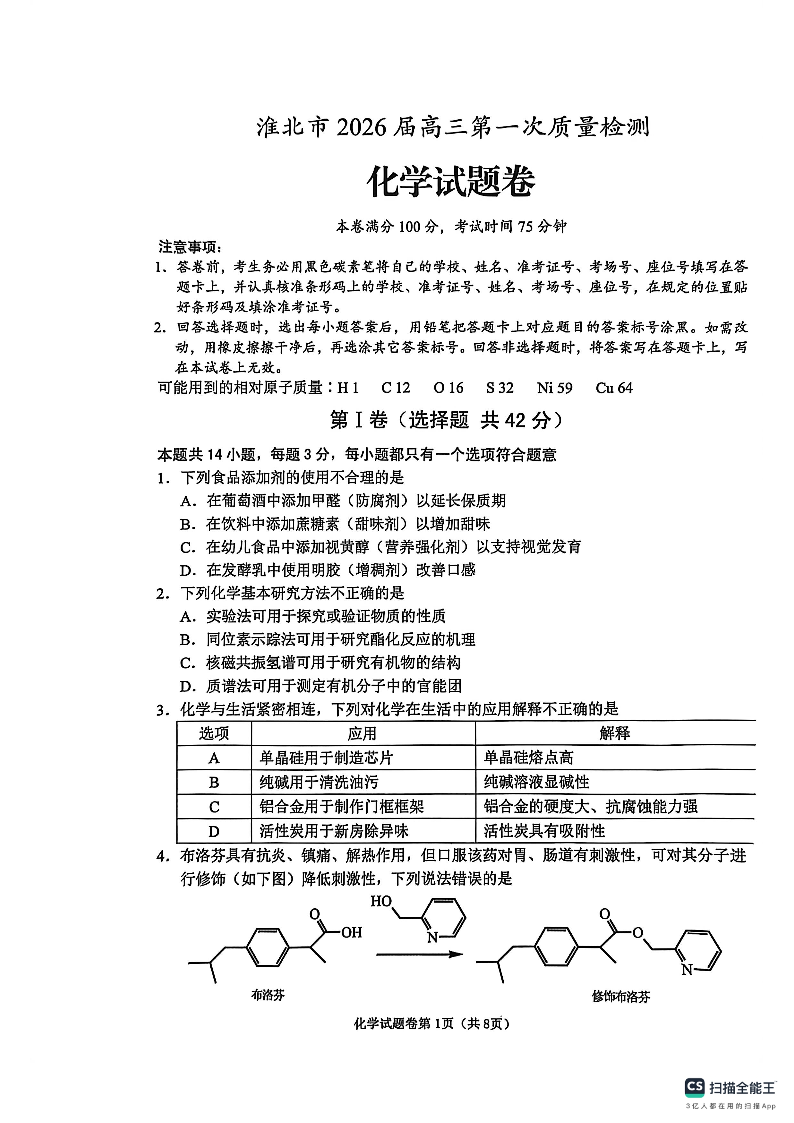 安徽省淮北市2026届高三年级第一次质量检测 化学.pdf