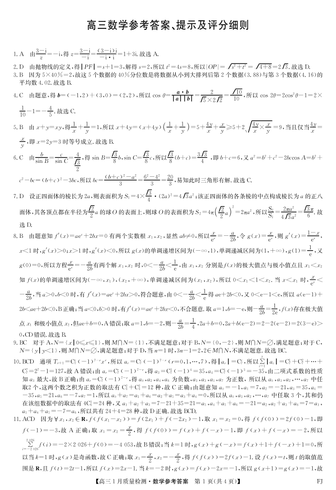 福建省莆田市2026届高中毕业班第一次质量检测 数学答案.pdf