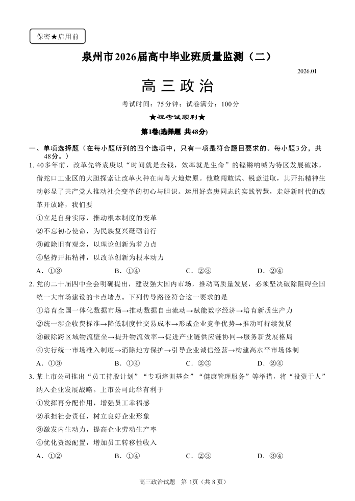 福建省泉州市2026届高中毕业班质量监测(二)政治.pdf
