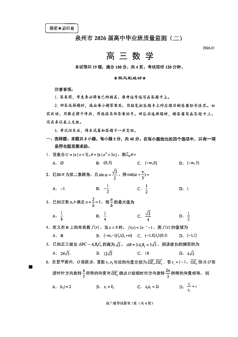 福建省泉州市2026届高中毕业班质量监测(二)数学.pdf