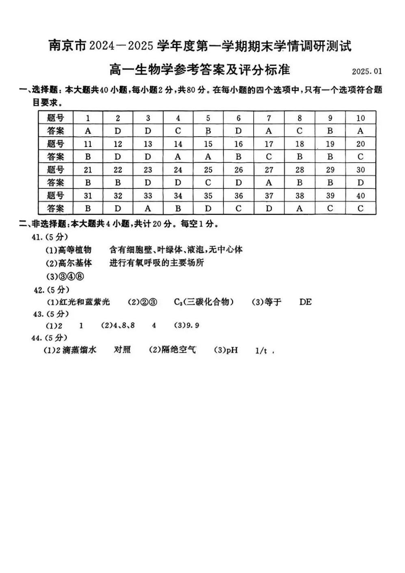 江苏省南京市2025-2026学年度第一学期高一期末学情调研测试 生物答案.pdf
