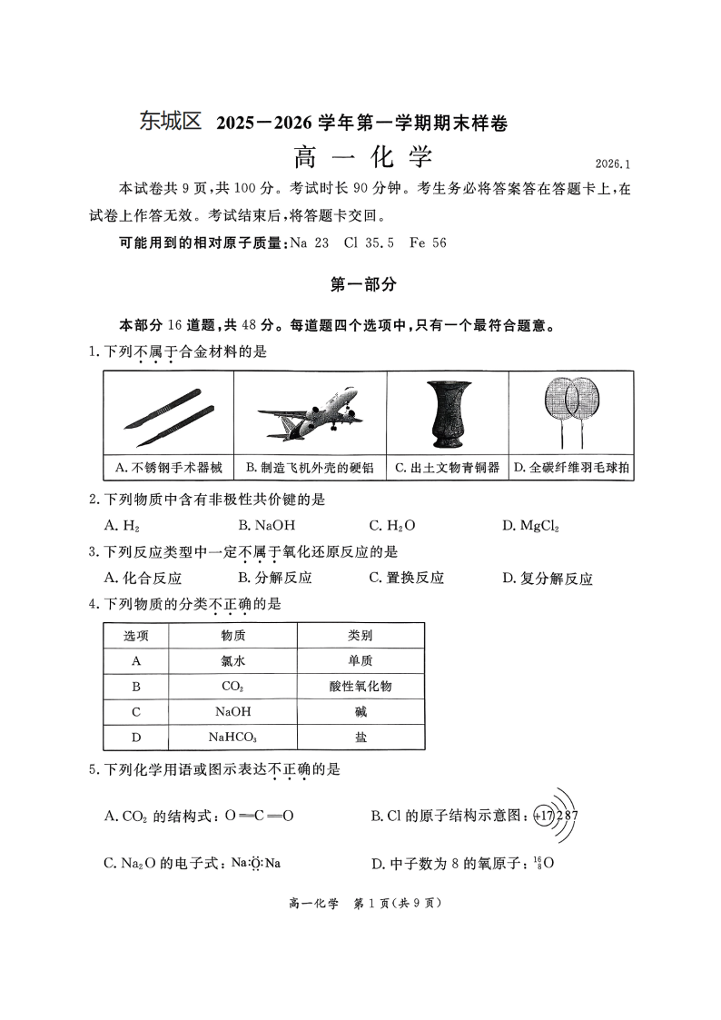 北京市东城区2025-2026学年高一上学期期末样卷 化学试题(含答案).pdf