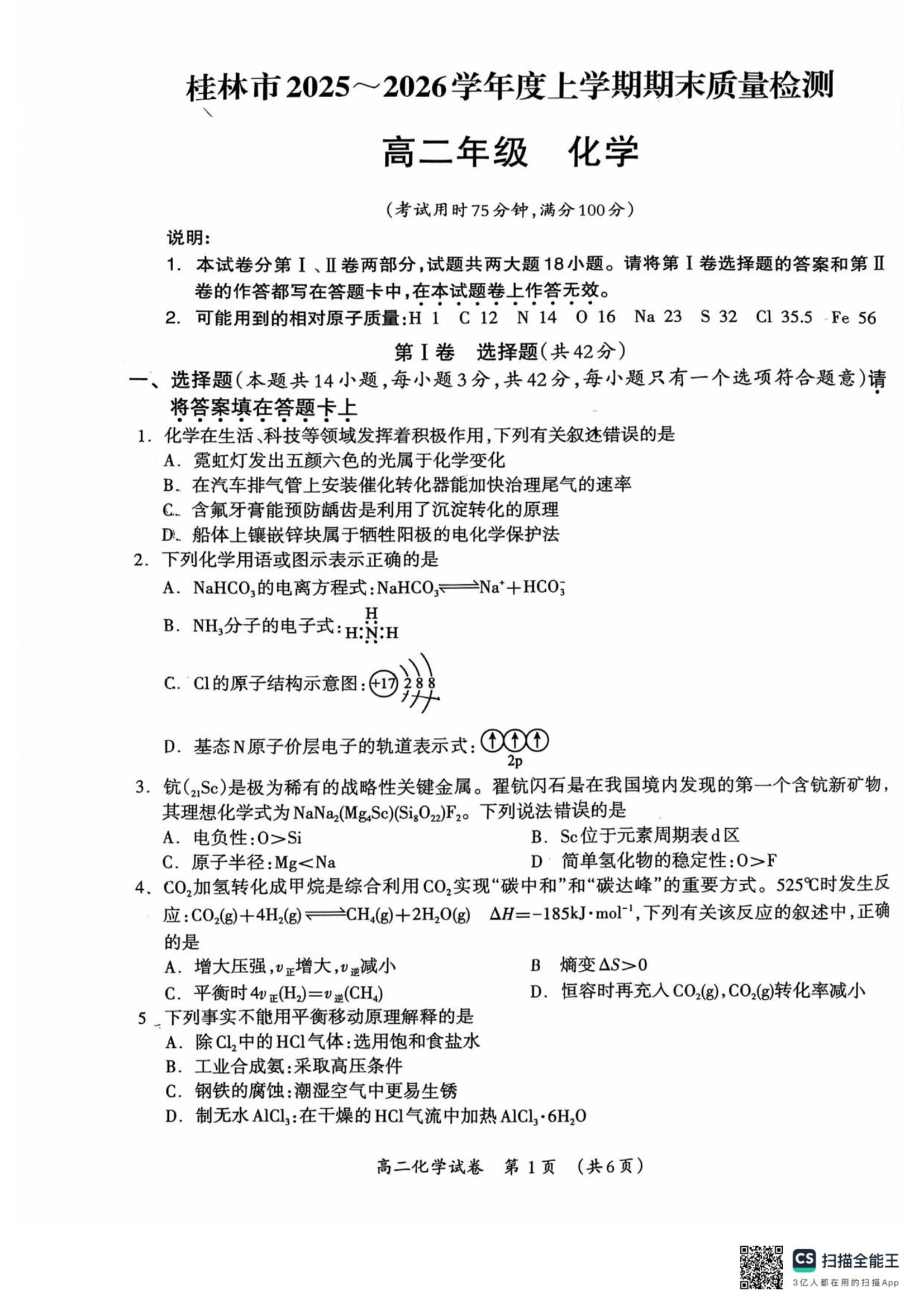 桂林市2025-2026学年高二年级上学期期末质量检测 化学.pdf