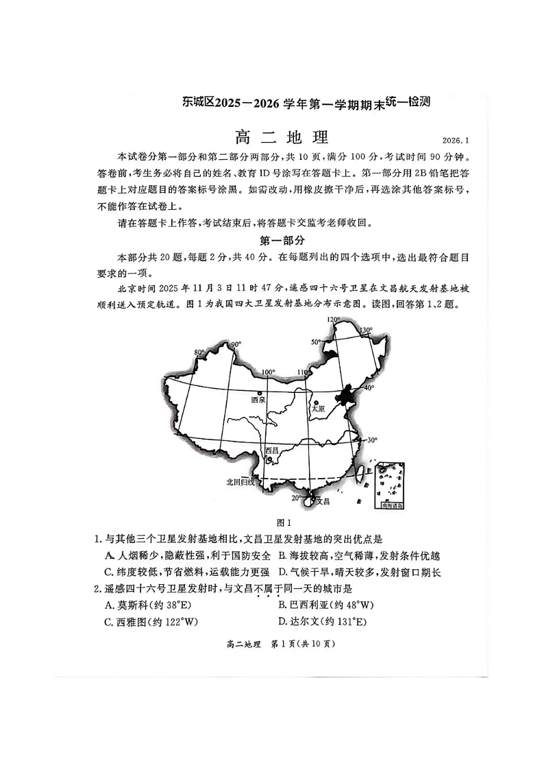 北京市东城区2025-2026学年高二上学期期末样卷 地理试题(含答案).pdf