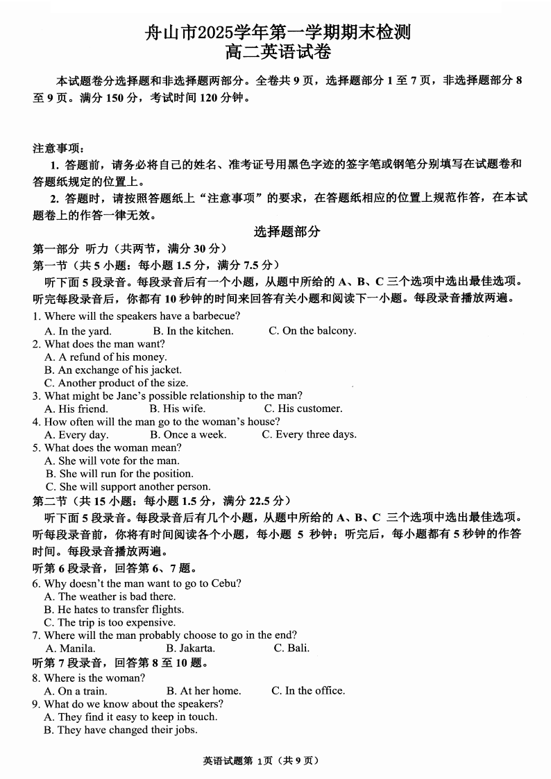 浙江省舟山市2025学年高二第一学期期末检测 英语.pdf