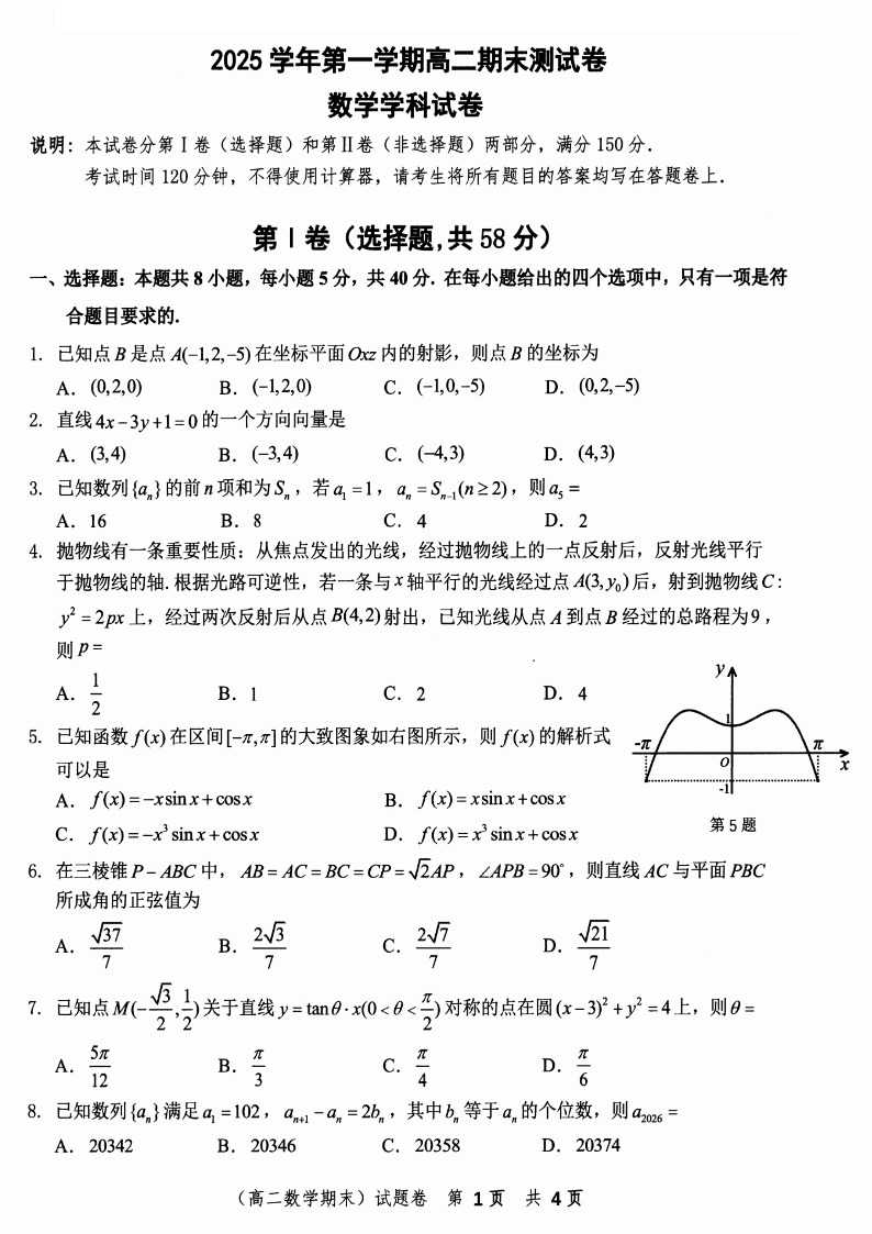 浙江省宁波市慈溪市2025学年高二第一学期期末测试 数学.pdf