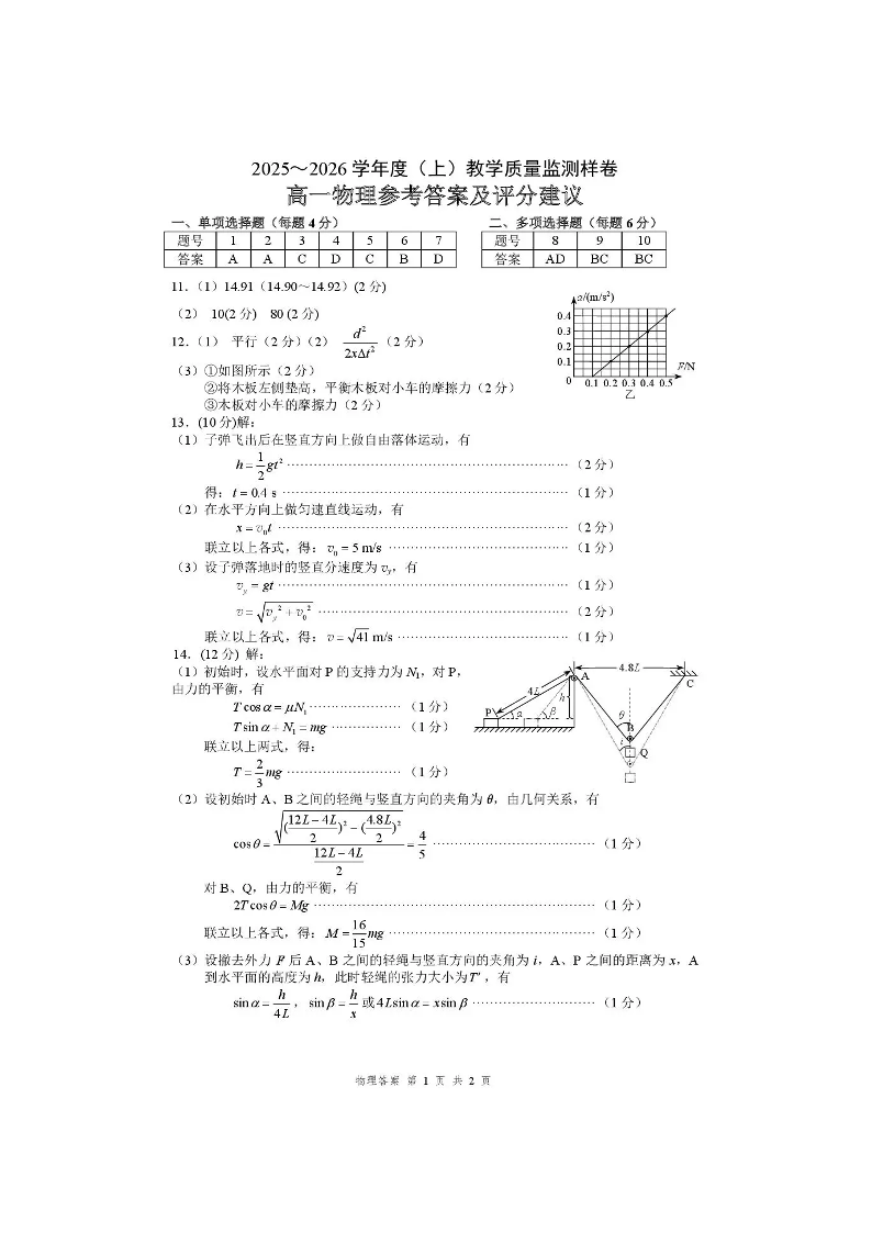攀枝花市2025-2026学年度高一(上)教学质量监测样卷 物理答案.pdf