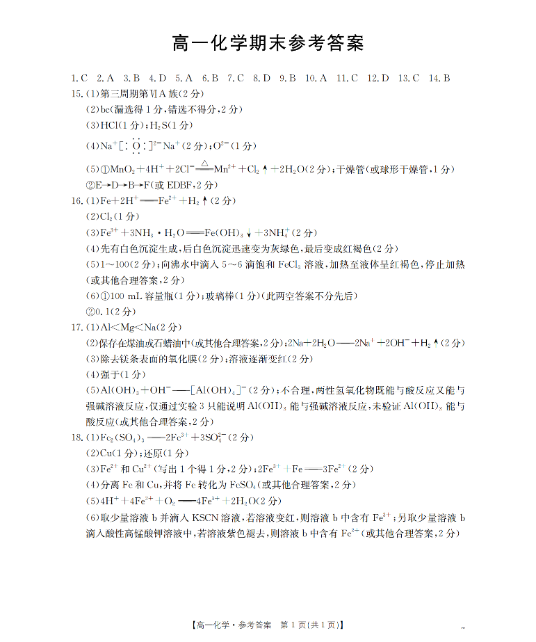 甘肃省定西地区2025-2026学年(上)高一期末考试 化学答案.pdf