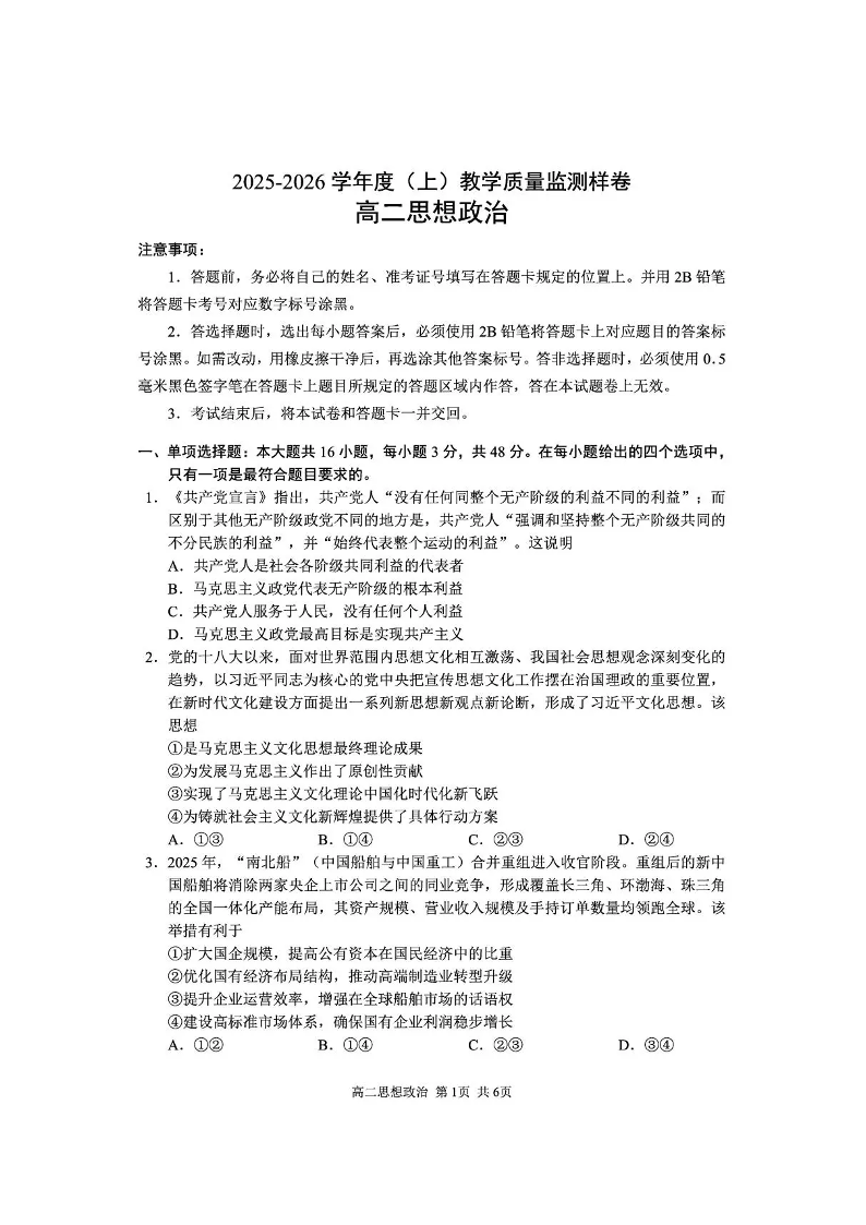 攀枝花市2025-2026学年度高二(上)教学质量监测样卷 政治.pdf