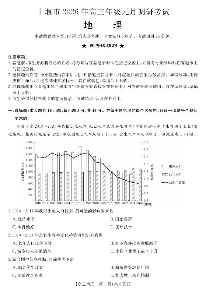 十堰市2026年高三年级元月调研考试 地理.pdf
