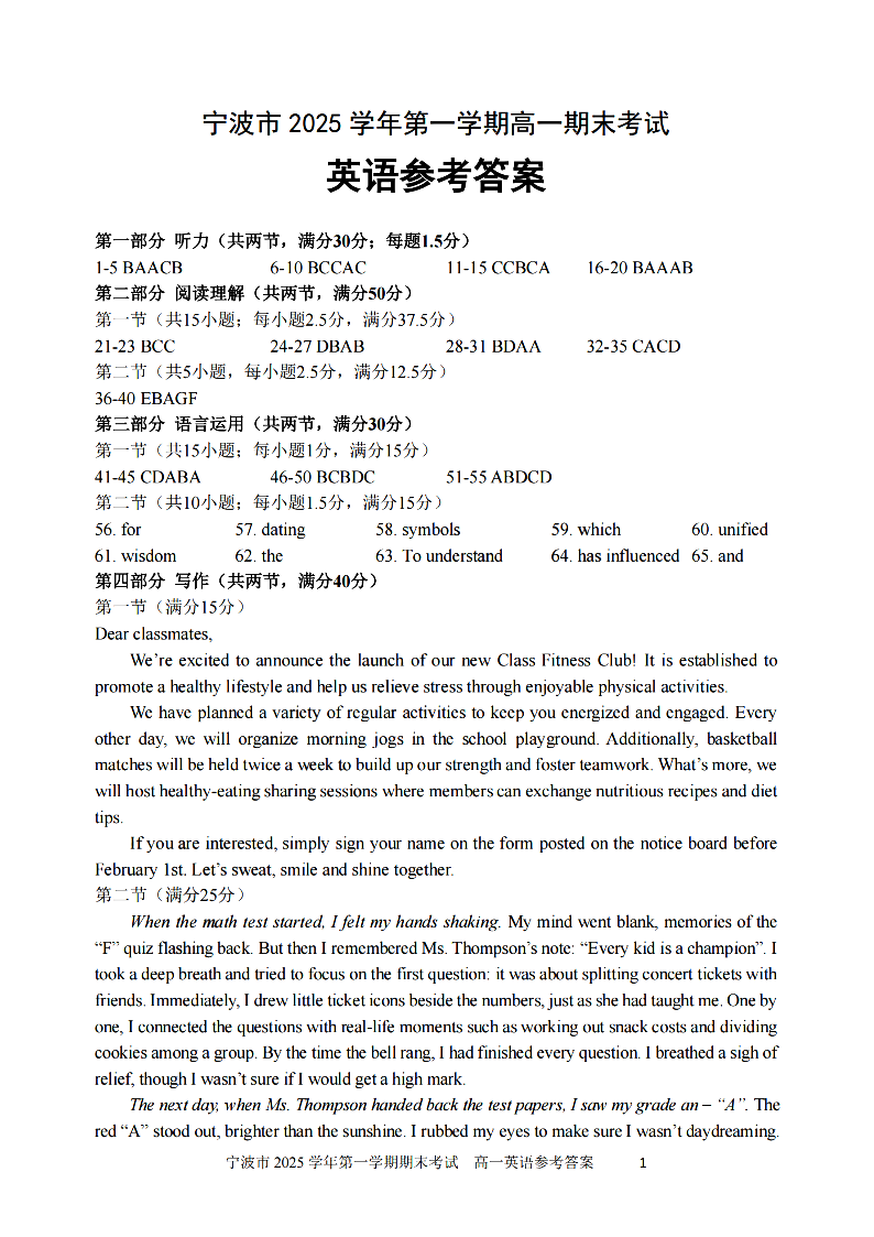 浙江省宁波市2025学年高一第一学期期末测试 英语答案.pdf