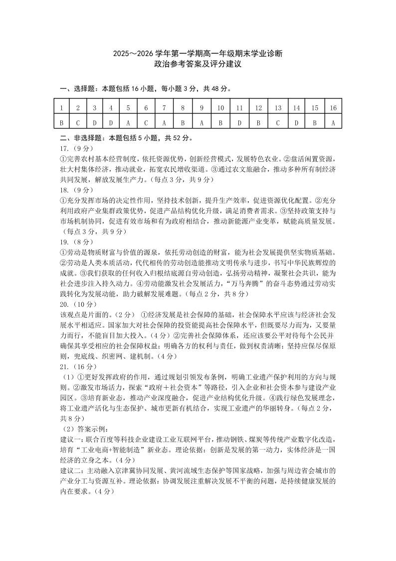 太原市2025-2026学年第一学期高一年级期末学业诊断 政治答案.pdf