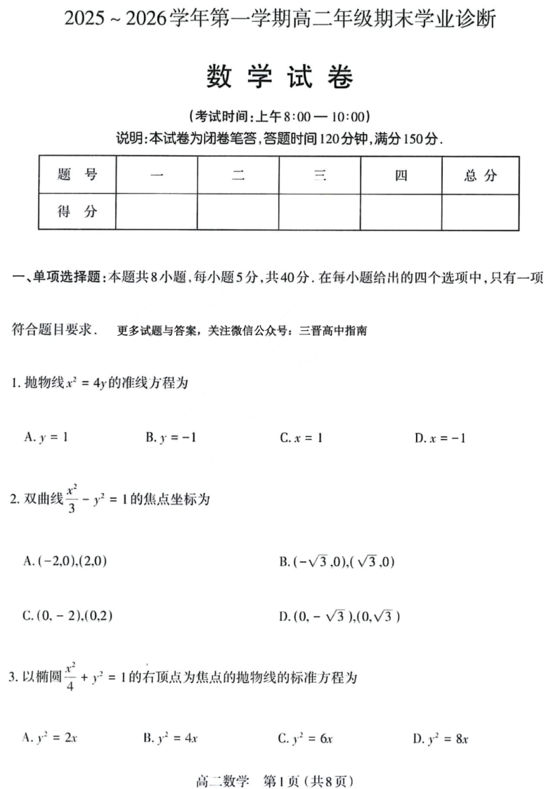 太原市2025-2026学年第一学期高二年级期末学业诊断 数学.pdf