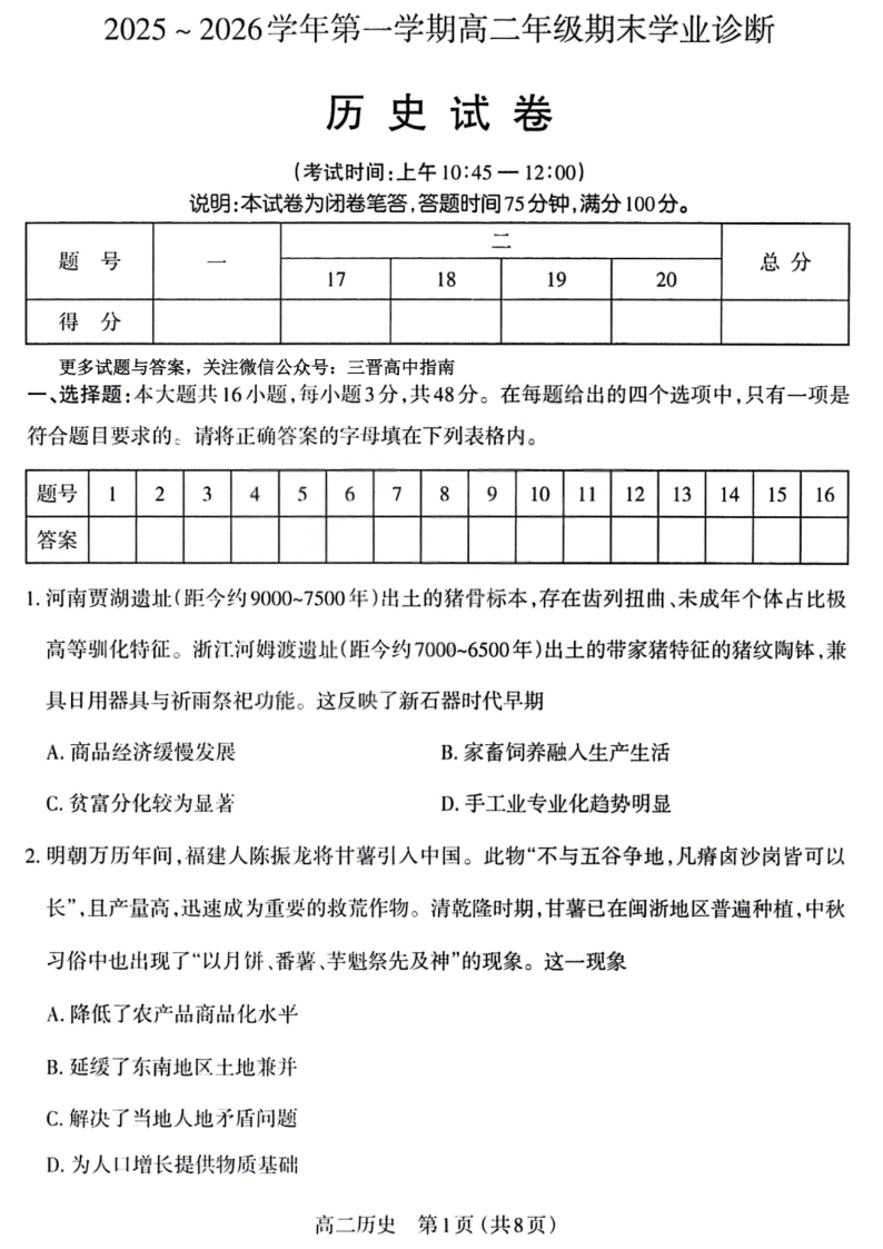 太原市2025-2026学年第一学期高二年级期末学业诊断 历史.pdf