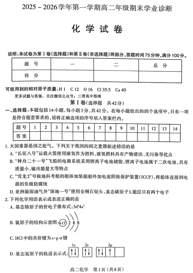 太原市2025-2026学年第一学期高二年级期末学业诊断 化学.pdf