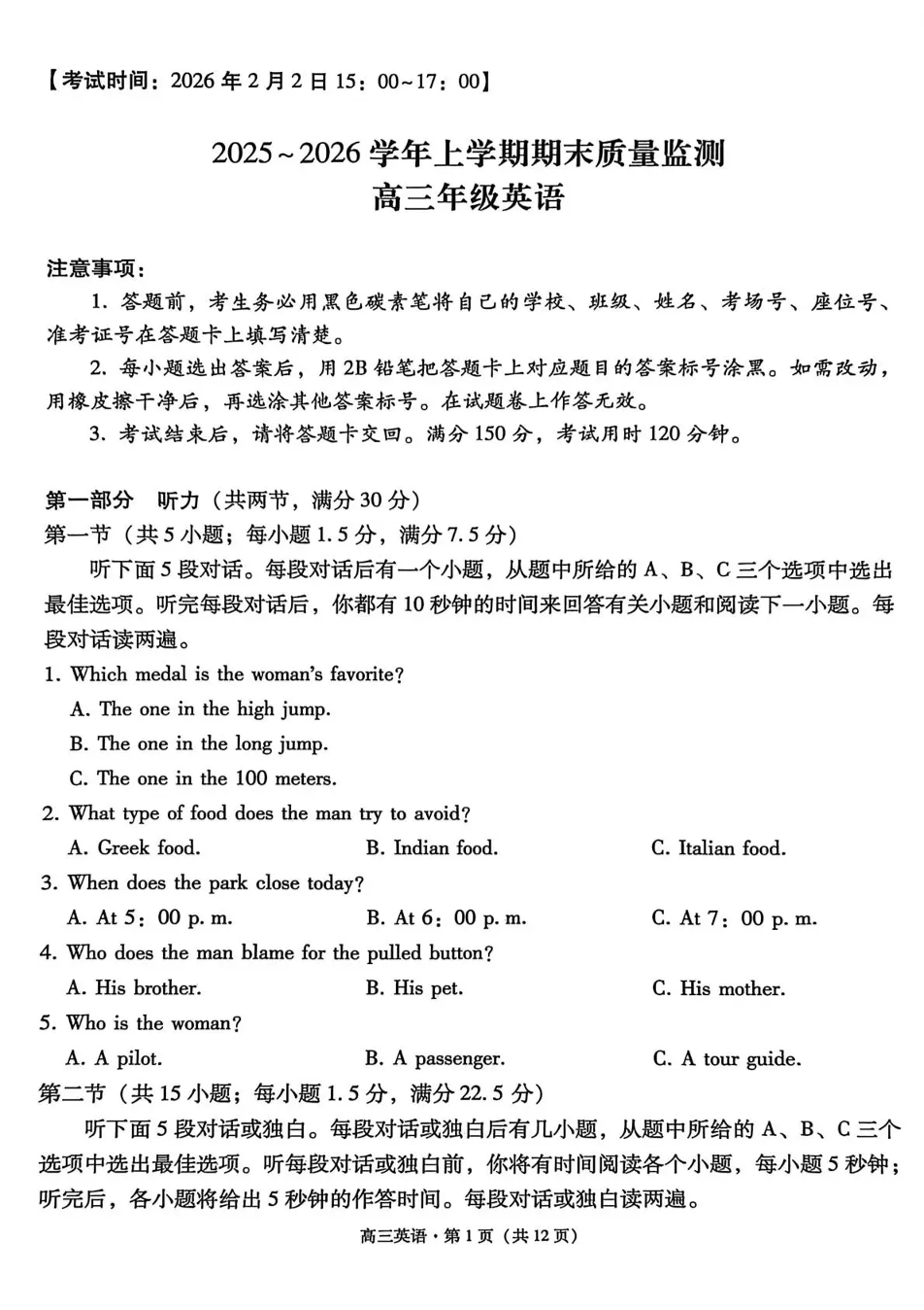 保山市2025~2026学年高三上学期期末质量监测 英语试题(含答案).pdf