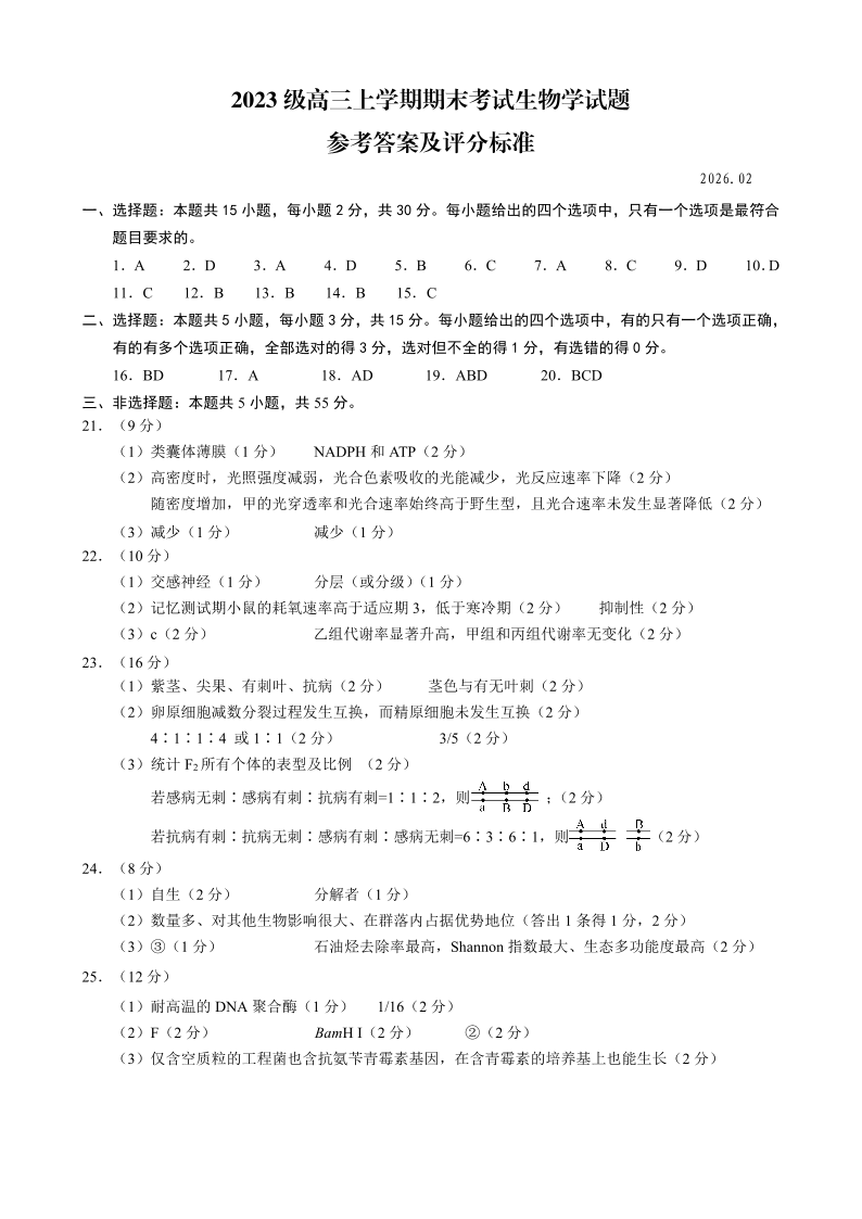 山东省日照市2023级高三年级上学期期末考试 生物答案.pdf