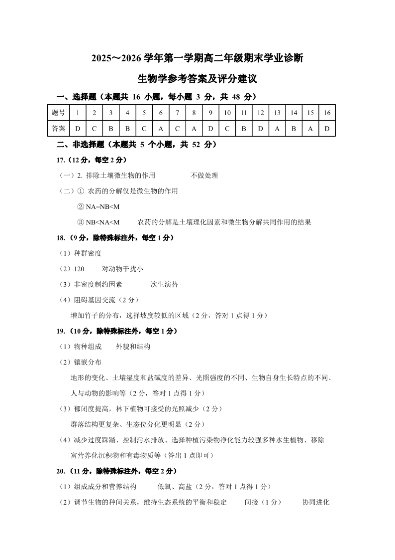 太原市2025-2026学年高二年级第一学期期末学业诊断 生物答案.pdf