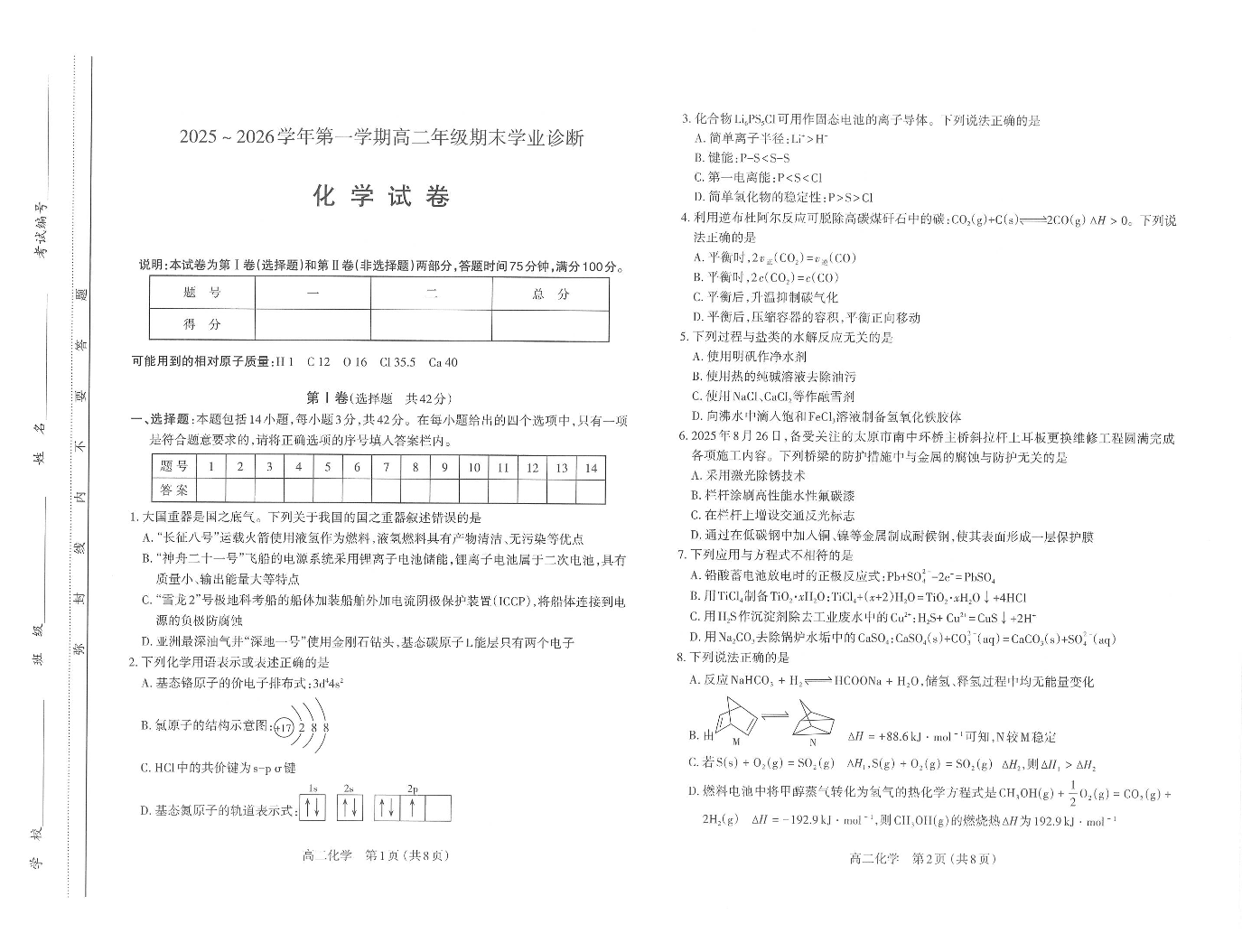 太原市2025-2026学年高二年级第一学期期末学业诊断 化学.pdf