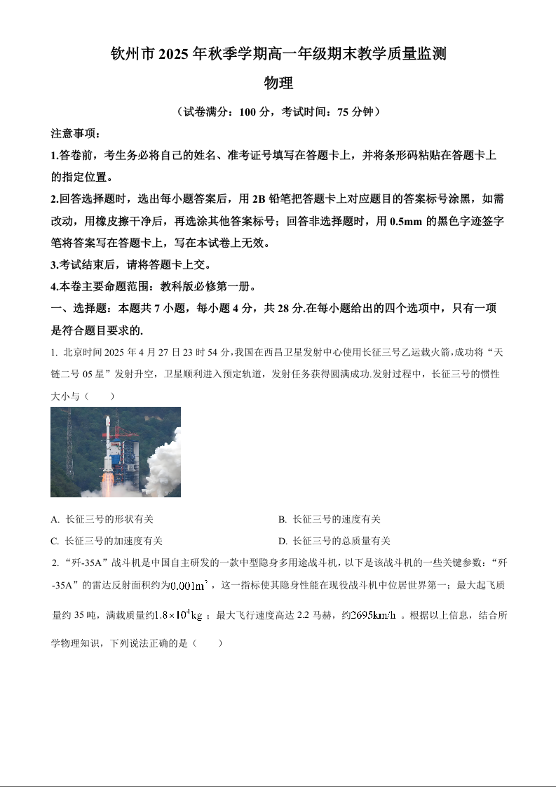 钦州市2025-2026高一上学期期末教学质量检测 物理试题(含答案).docx