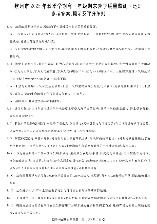 钦州市2025-2026高一上学期期末教学质量检测 地理答案.pdf