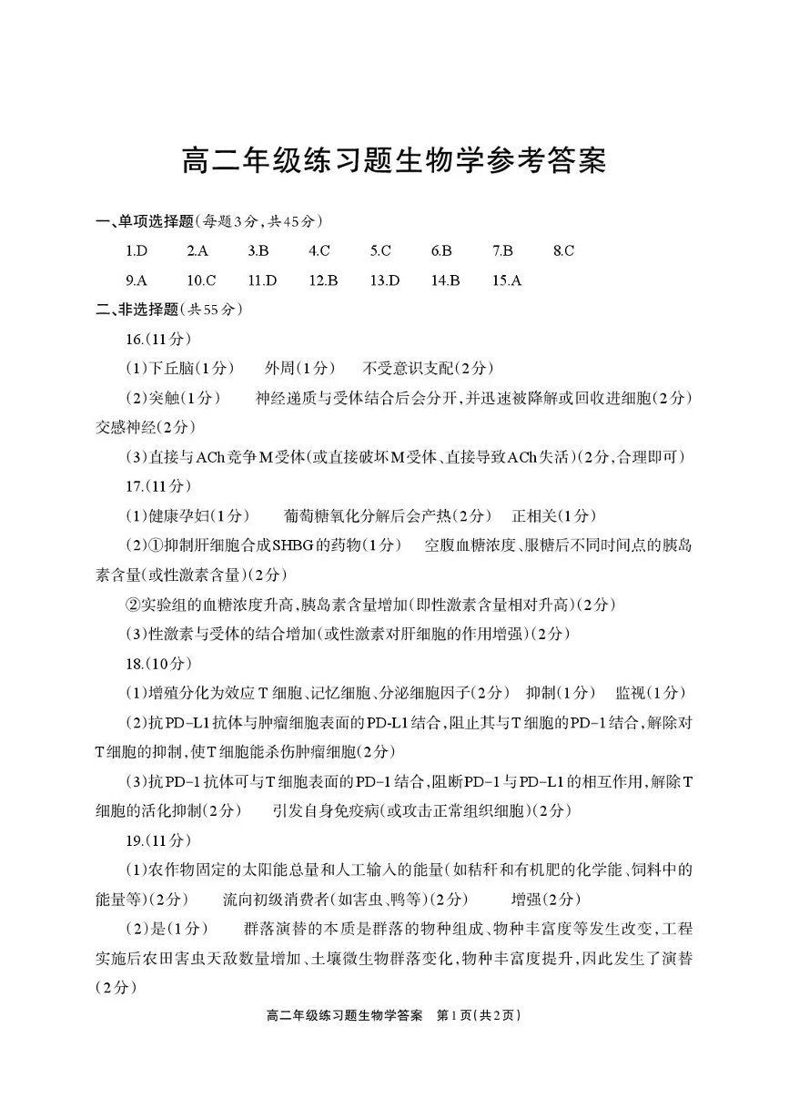 德阳市2025—2026学年高二上学期期末考试 生物答案.pdf