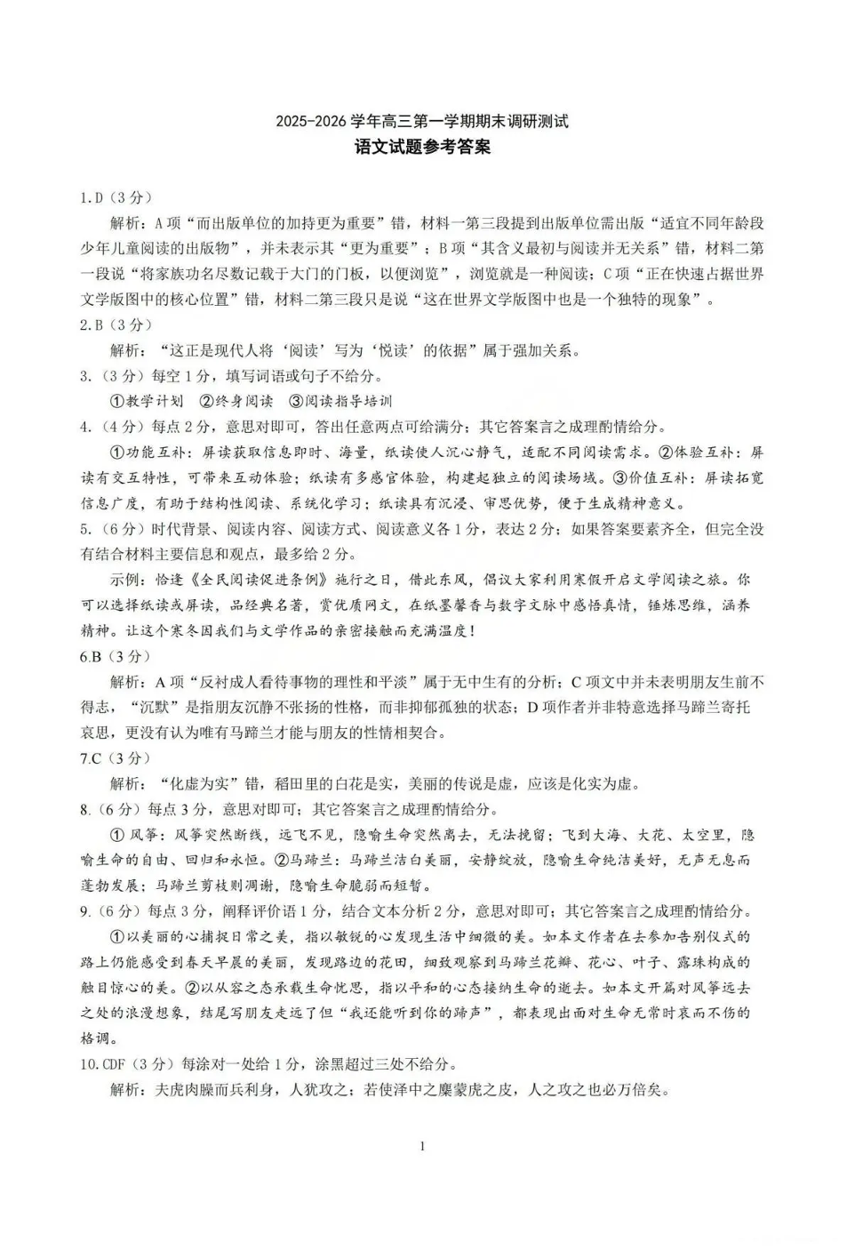 2025-2026学年高三第一学期期末调研测试 语文答案.pdf