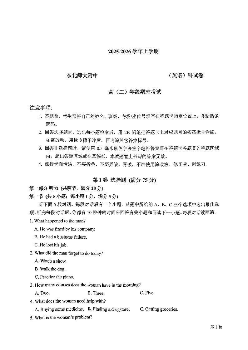 东北师大附中2025-2026学年上学期高二年级期末考试 英语试题(含答案).pdf