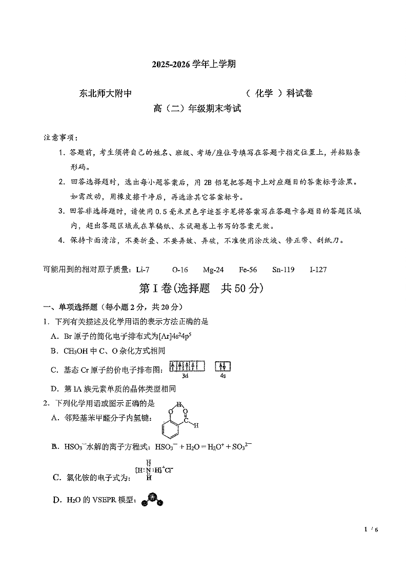 东北师大附中2025-2026学年上学期高二年级期末考试 化学试题(含答案).pdf
