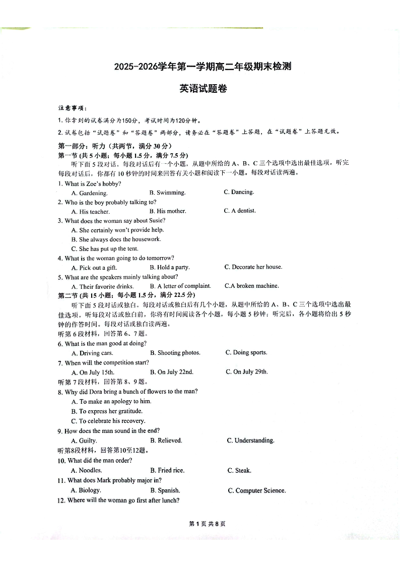 安徽省皖中名校联考2025-2026学年高二上学期2月期末 英语.pdf