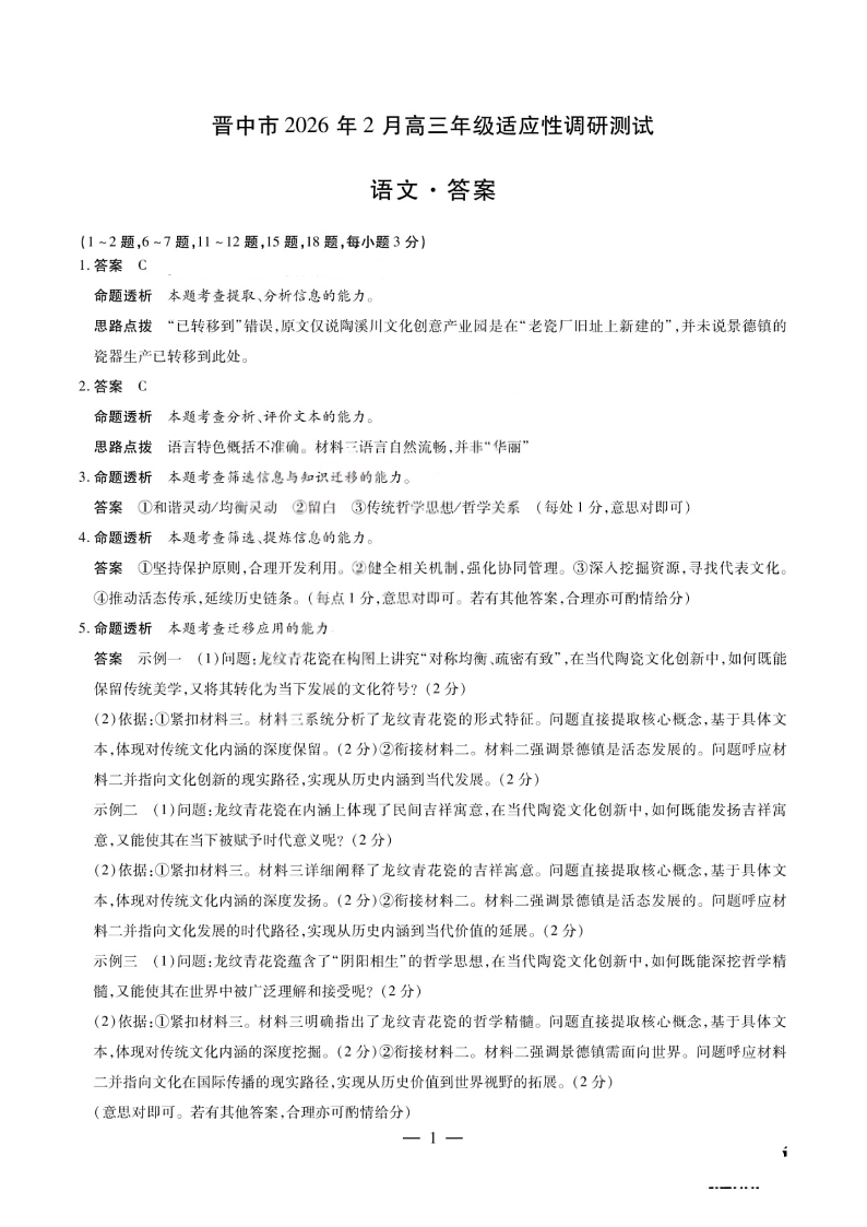 山西省晋中市2026年2月高三年级适应性调研考试 语文答案.pdf