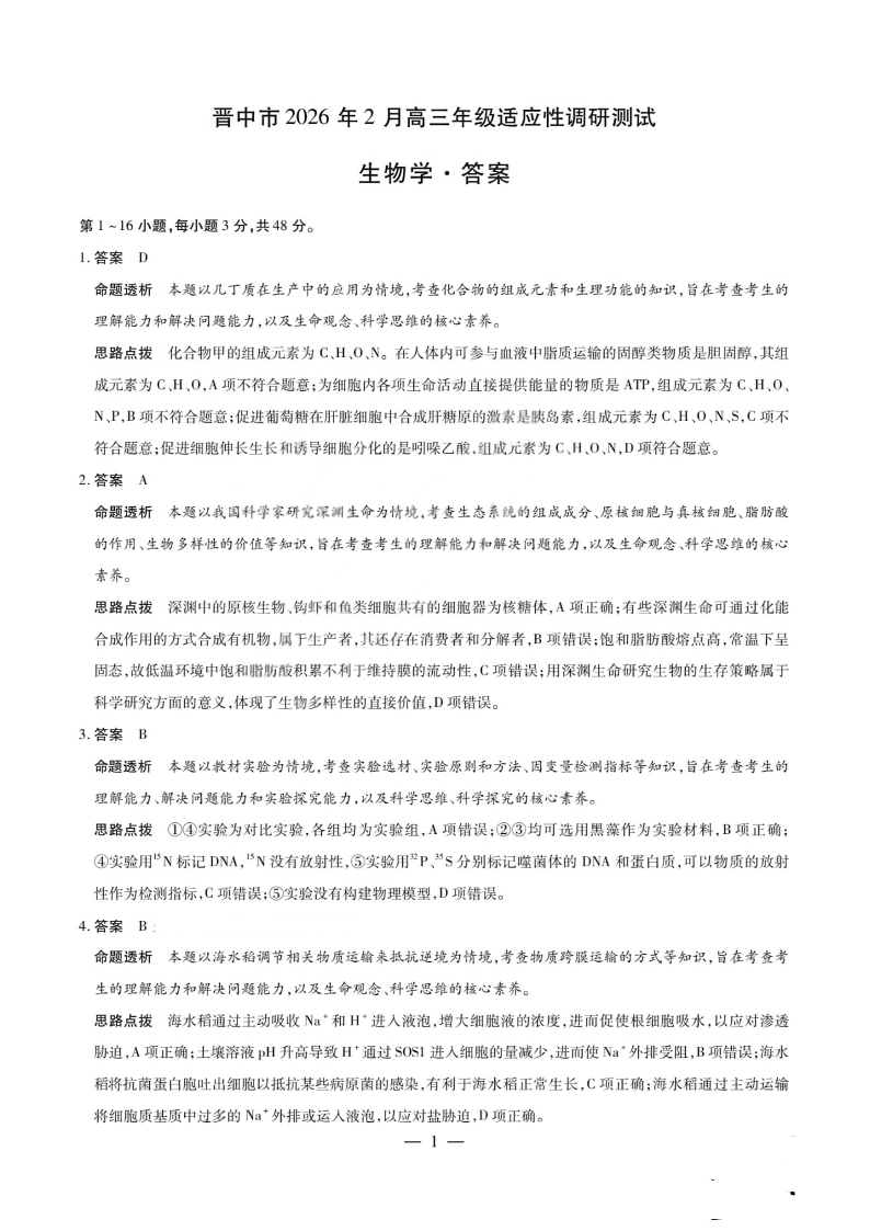 山西省晋中市2026年2月高三年级适应性调研考试 生物答案.pdf