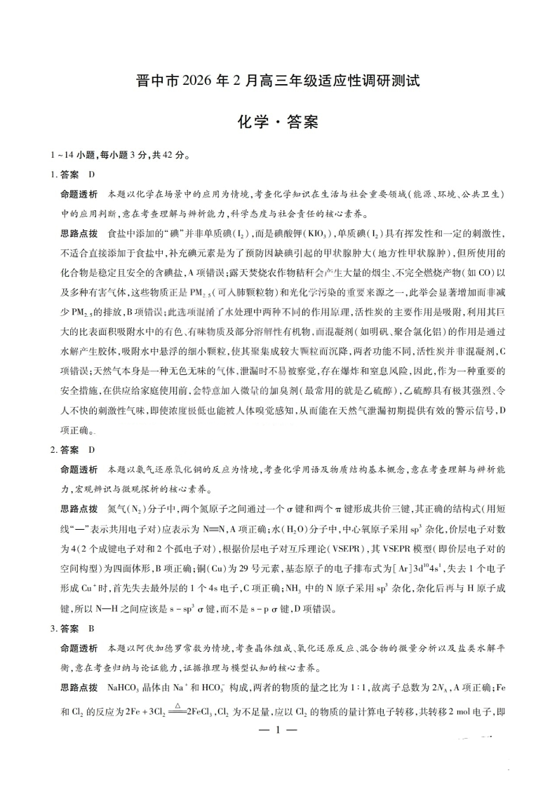 山西省晋中市2026年2月高三年级适应性调研考试 化学答案.pdf