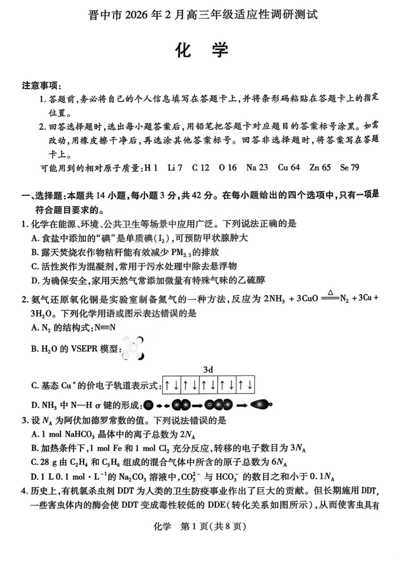 山西省晋中市2026年2月高三年级适应性调研考试 化学.pdf