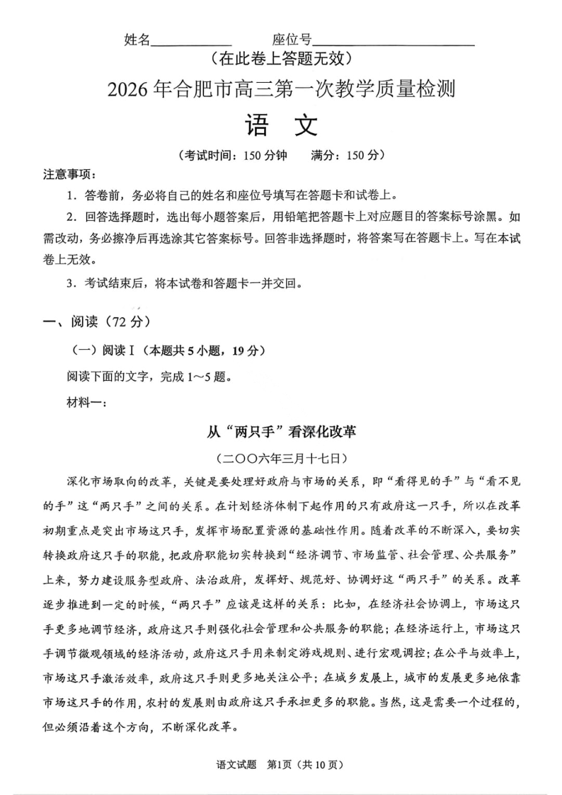 2026年合肥市高三第一次教学质量检测 语文.pdf