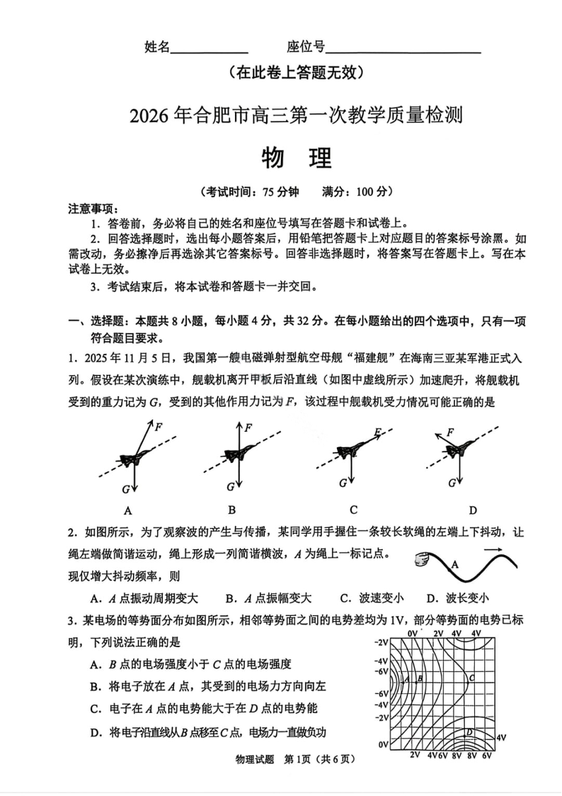2026年合肥市高三第一次教学质量检测 物理.pdf