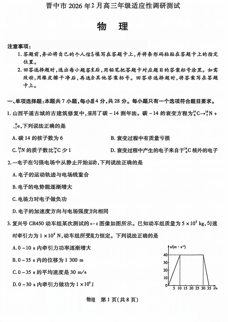 晋中市2026年2月高三年级适应性调研测试物理.pdf