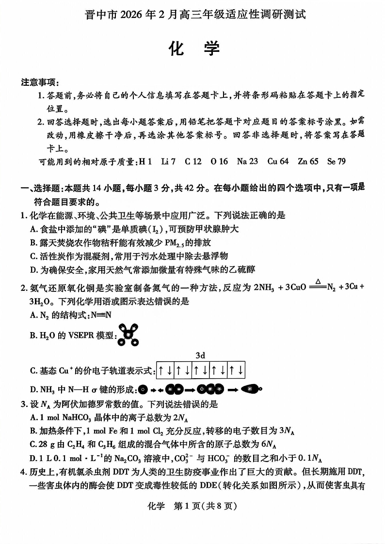 晋中市2026年2月高三年级适应性调研测试化学.pdf
