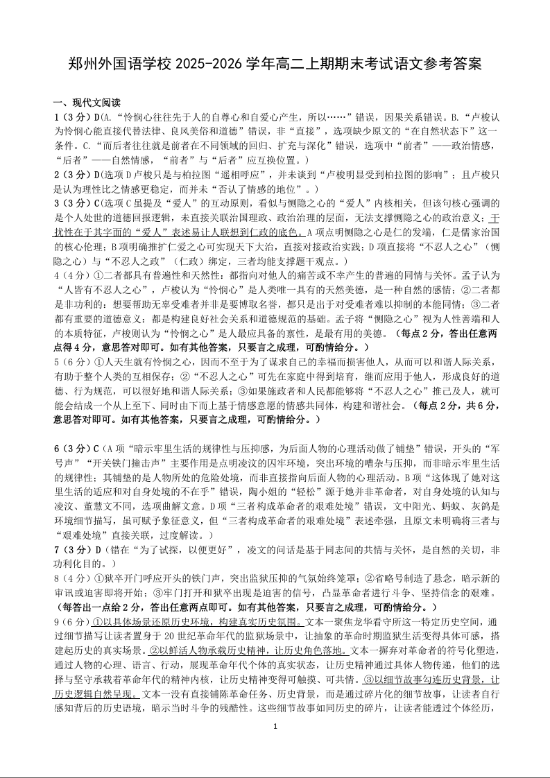 郑州外国语学校2025-2026学年高二上学期期末试卷 语文答案.docx