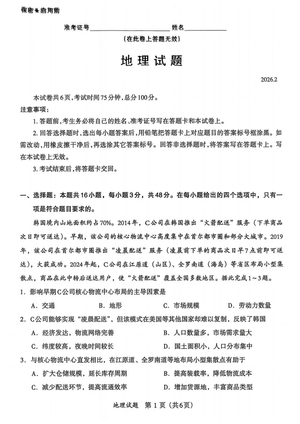 福建省名校联盟2026届高三下学期开学考试 地理.pdf